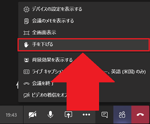 アイコンがツールバーに表示されていなければ・・・をクリックして表示されるメニューに手を下げる項目が表示されます。手を下げるをクリックすることで挙手状態を解除することができます。