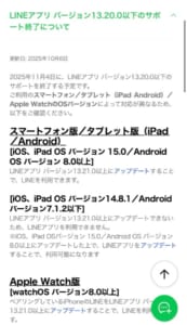 LINEアプリ バージョン13.20.0以下のスマホの機種の方は、2025年11月4日からサポート終了するのは本当です。