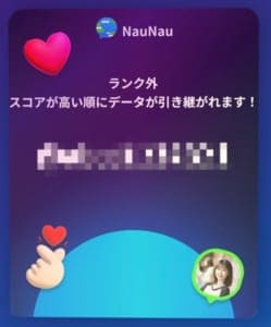 友達に自分のNauNau IDを入力してもらうことでランクが上がり、ランクが高いほど早く引き継ぎ機能が追加されます。