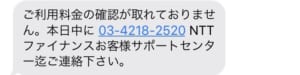 NTTファイナンスでは、SMSメッセージによる「料金の支払いがない」という案内は実施していないため、絶対に電話をかけないで無視するようにしましょう。
