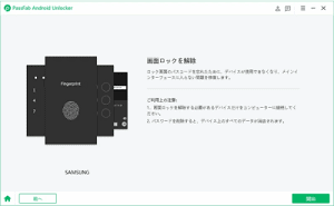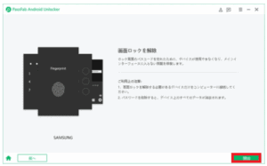 「PassFab Android Unlocker」でロックを解除するには、「PassFab Android Unlocker」を起動し、画面ロックを解除をクリックしてください。