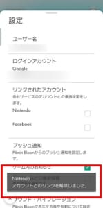 Nintendoの✔部分をタップすると、連携が解除されました。と表示されます。