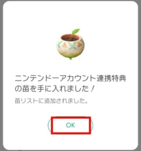 連携が済むと、上の画像のように「ニンテンドーアカウント連携特典の苗を手に入れました!」と表示されます。OKをタップしてください。これで無事に苗がもらえました。