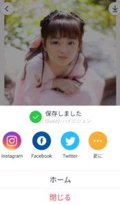 また、右上の矢印ボタンを押すとお使いの端末に保存され、あらゆる手段(TwitterやFacebook等)で共有することができます。