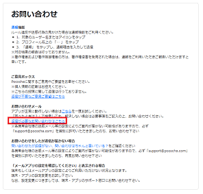 2020年12月5日時点では、こちらから問い合わせを送ろうとすると、ポコチャアプリが起動してアプリから問い合わせることになるため、「アプリでの作業」の手順からメッセージを送っても良いでしょう。