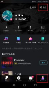 下メニューから「マイページ」をタップ後右上の「設定」をタップ。