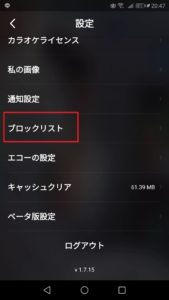 右上の「設定」をタップ。設定メニューから「ブロックリスト」をタップ。