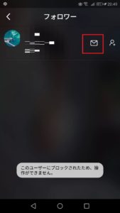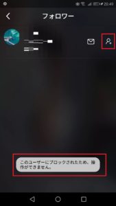 フォロワーの右横にある「人マーク」をタップしてみると「このユーザーにブロックされたため、操作できません。」と表示されます。