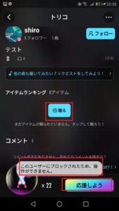 同じ画面から「贈る」をタップして「応援しよう」をタップすると「このユーザーにブロックされたため、操作できません。」と表示されることが確認できます。