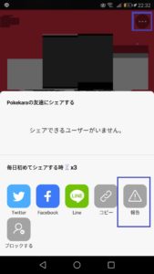 マイページの右上にある「・・・」をタップ。メニューに「報告」が表示されるのでタップ。
