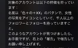 どちらにしても噂になっている特徴に近いアカウントはユーザーにとって有益なアカウントである可能性が低いため、見つけ次第対処することをおすすめします。