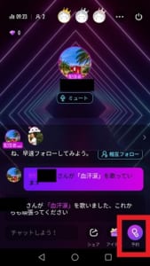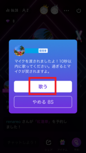 ルーム開設者からマイクが渡されると上の画面のような表示がされるので、歌うをタップしてください。
