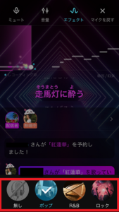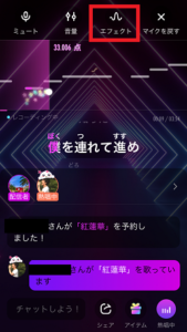 カラオケの曲が流れ始めた際に、上のメニューからエフェクトをタップしましょう。