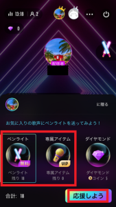 様々なアイテムが表示されますがその中から一番右端にあるダイヤモンドタップしてから応援しようをタップしてください。
