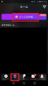 まず、Pokekaraの下メニューより、ルーム⇒ルームを作成の順番でタップしましょう。