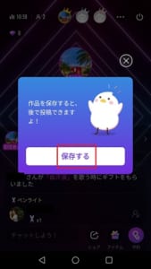 次に「作品を保存すると後で投稿できますよ!」と表示されるので保存するをタップします。