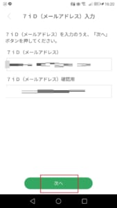 「会員登録」をタップ後、7iDに登録するためのメールアドレスを2回入力して「次へ」をタップ。