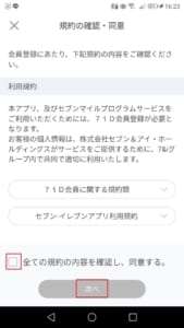 規約画面が表示されるので、規約に同意できる場合はチェックを入れ「次へ」をタップ。