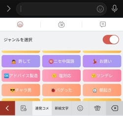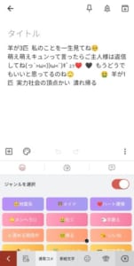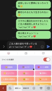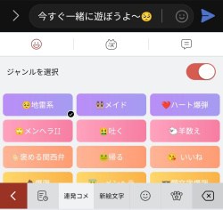 ジャンルは地雷系や塩対応など様々なジャンルが用意されており、友人や家族と送信しあうと面白い機能です。