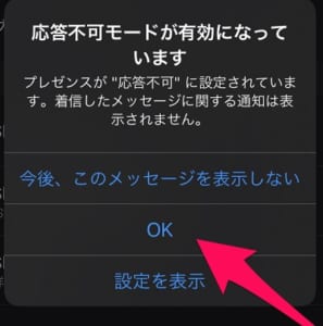 応答不可に設定すると確認画面が表示されるので、真ん中にある「OK」をタップすれば設定完了です。