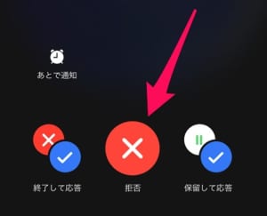 割り込み着信に応答したくない場合は、表示されるアイコンから「拒否」を選びましょう。