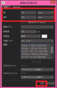 画面の真ん中に上のようなメニューが表示されるので「幅」「高さ」を128に設定して、最後に「OK」をクリックしてください。