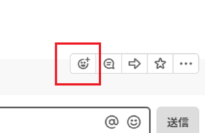 リアクションしたいメッセージにカーソルを持っていくと上のようにメニューが表示されるので「絵文字マーク」をクリックしましょう。