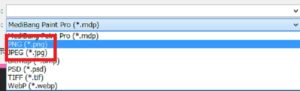 デフォルトではメディバンのファイル形式「mdp」になっているのですが、これではslackに登録できないので、「png」「jpg」に変更して保存しましょう。