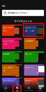 Spotifyを開き、下部のメニューから検索をタップします。カテゴリから、メードフォー・ユーをタップします。