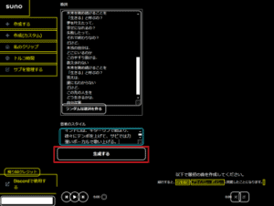曲のスタイルを入力し、生成するを押すと入力した歌詞に合わせて曲が作られます。
