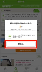 検索条件を保存するには、該当物件一覧画面の「条件保存」をタップします。