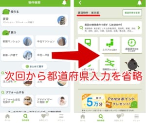 保存条件を呼び出さずに、次回から「借りる」「買う」の画面選択から都道府県の入力を省略して検索することができます。