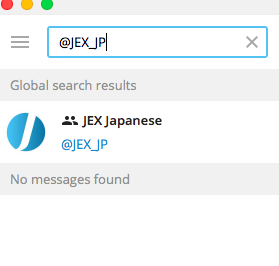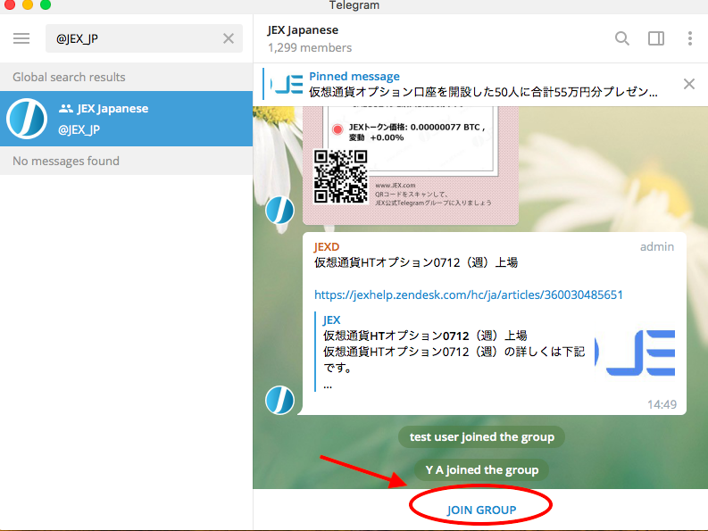 ここでは仮想通貨のグループ「JEX日本語公式グループ」を例にして、検索してみます。