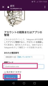 認証コードがテレグラムに届くので入力して「サインイン」をタップ。