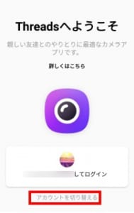 Threadsをインストール後、インスタのアカウントへログインが必要になります。既にインスタのアプリを持っていて、ログインしている場合は上の画像のようにログインしているアカウントが表示されるのでタップするだけでログインが完了します。