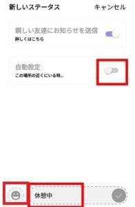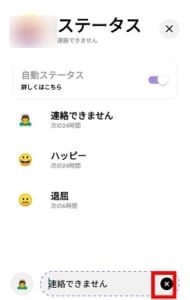自分の状況に合う絵文字とメッセージを入力したらをタップしましょう。そうすると、自分のアイコン部分にステータスが表示されるようになります。