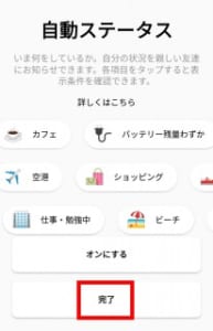 ログイン完了後は、自動ステータスの設定画面が表示されます。自動ステータスの設定や説明については後ほど詳しく解説するので、今回は自動ステータスを設定せずにそのまま操作を進めていきます。ですので、完了をタップしましょう。