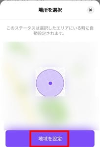 自動ステータスをオンにした後、😊をタップして、絵文字+メッセージを入力しましょう。そうすると自動設定の項目が表示されるので設定をオンにしてください。今いる自分の場所が表示されるので、地域を設定をタップしましょう。