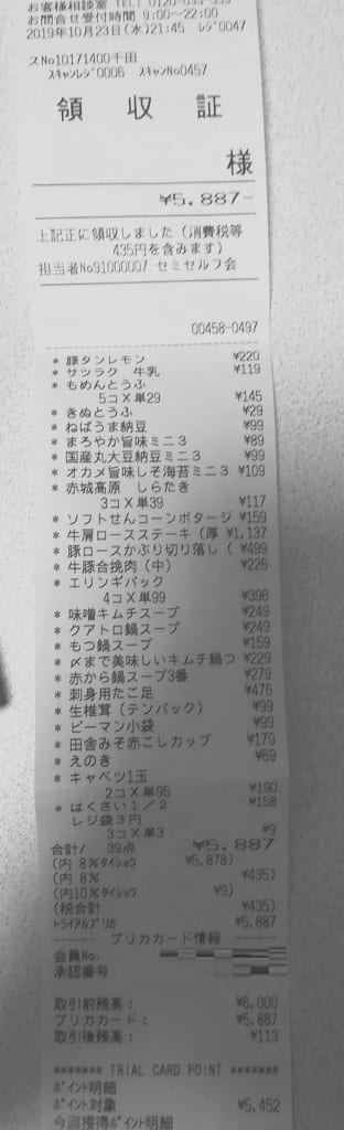 私は週に1回食材を購入して1週間その食材でやりくりしているのですが、正直かなりの量を購入したにも関わらず、この金額で済みました。