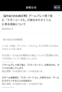ツムツムではゲームを起動した直後や、ゲームをプレイして終了した直後に「エラーコード:1」のエラーが発生してしまう問題が多発しました。