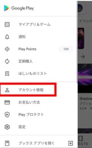 Google Playが開いたら、左上の横棒3本線をタップして、メニューからアカウントをタップしてください。