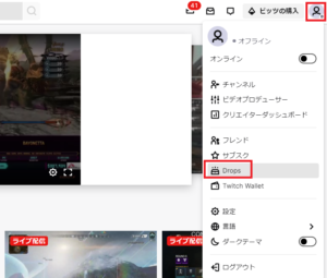 パソコンからドロップのインベントリを確認する場合は、右上のアイコンをクリックします。次にメニューからDropsをクリックしましょう。