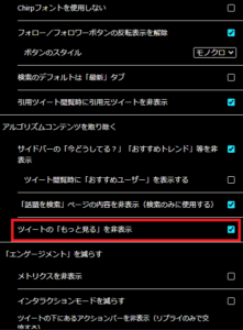 Tweetの「もっと見る」非表示をチェックする事で、もっと見つけるを消すことができます。