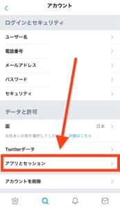 アカウント設定一覧から「アプリとセッション」を選択してタップします。