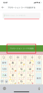 右画面のように表示されるので、右上の「プロモーションコード追加」をタップしましょう。