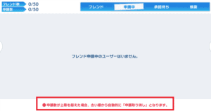 これを超過すると、古い履歴から自動的に申請取り消し扱いとなってしまうため、一度に多くの相手にフレンド申請をしても50人までしか待てません。