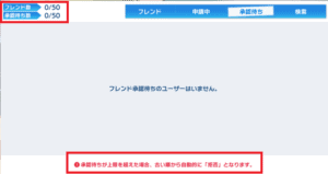 50人を超過すると古いものから自動的に拒否・申請取り消しされてしまうため、優先的にフレンド登録したい相手は早めに追加するようにしましょう。