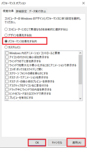 視覚効果をパフォーマンス優先を選択し、適用OKの順にクリックすればOKです。