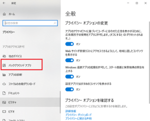 バックグラウンドアプリを選択し、不要なアプリケーションの横にあるバーをオフ状態にすればOKです。