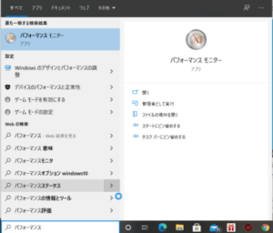 「視覚効果をパフォーマンス優先」にするには、デスクトップ左下にある検索窓に「パフォーマンス」と入力し、表示されたWindowsのデザインとパフォーマンスの調整をクリックしてください。
